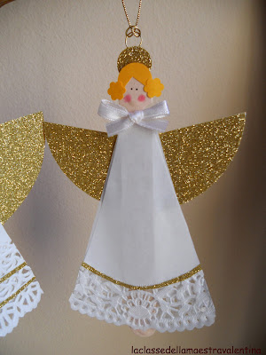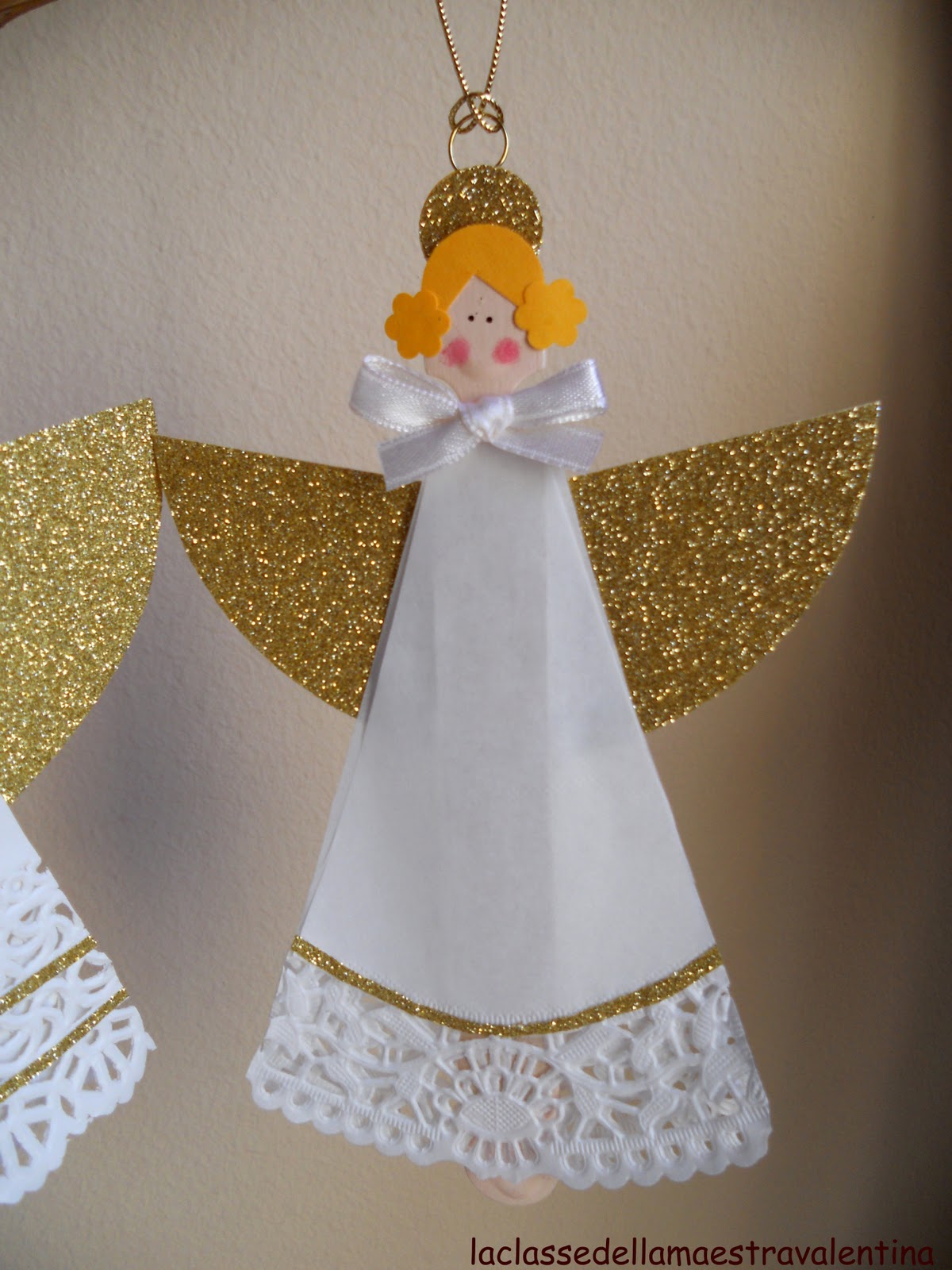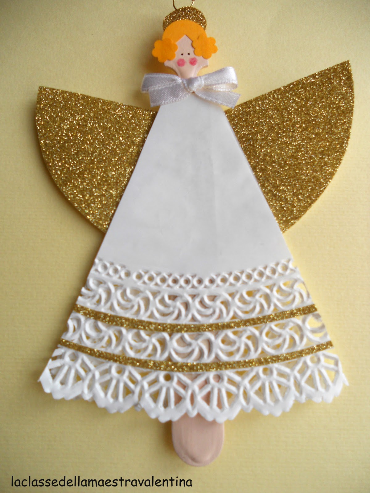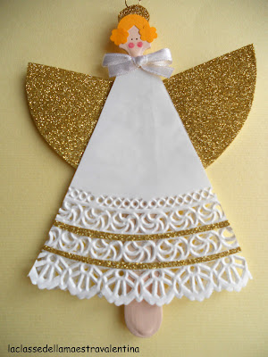 Così, dopo aver meditato cosa poter fare… ho preso dei sotto torta pizzosi, delle bacchette di legno (acquistate in un negozio di casalinghi), nastrino per il fiocchetto, cartoncino giallo per i capelli, carta dorata per ali e aureola, vinavil... ed ecco che tra pizzi e merletti escono quattro angioletti.