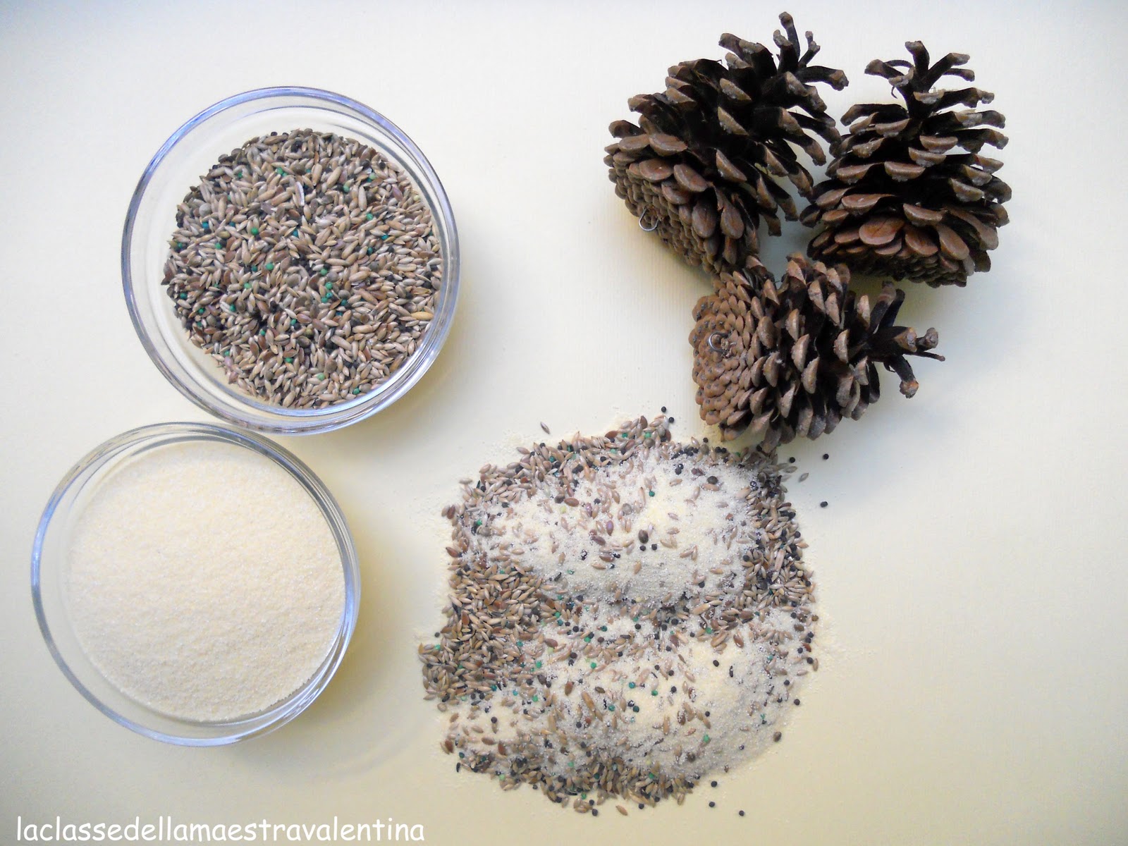 Mischiate i semini con acqua e semolino, quando “l’impasto” risulterà compatto, inserite delle piccole porzioni tra le fessure della pigna.