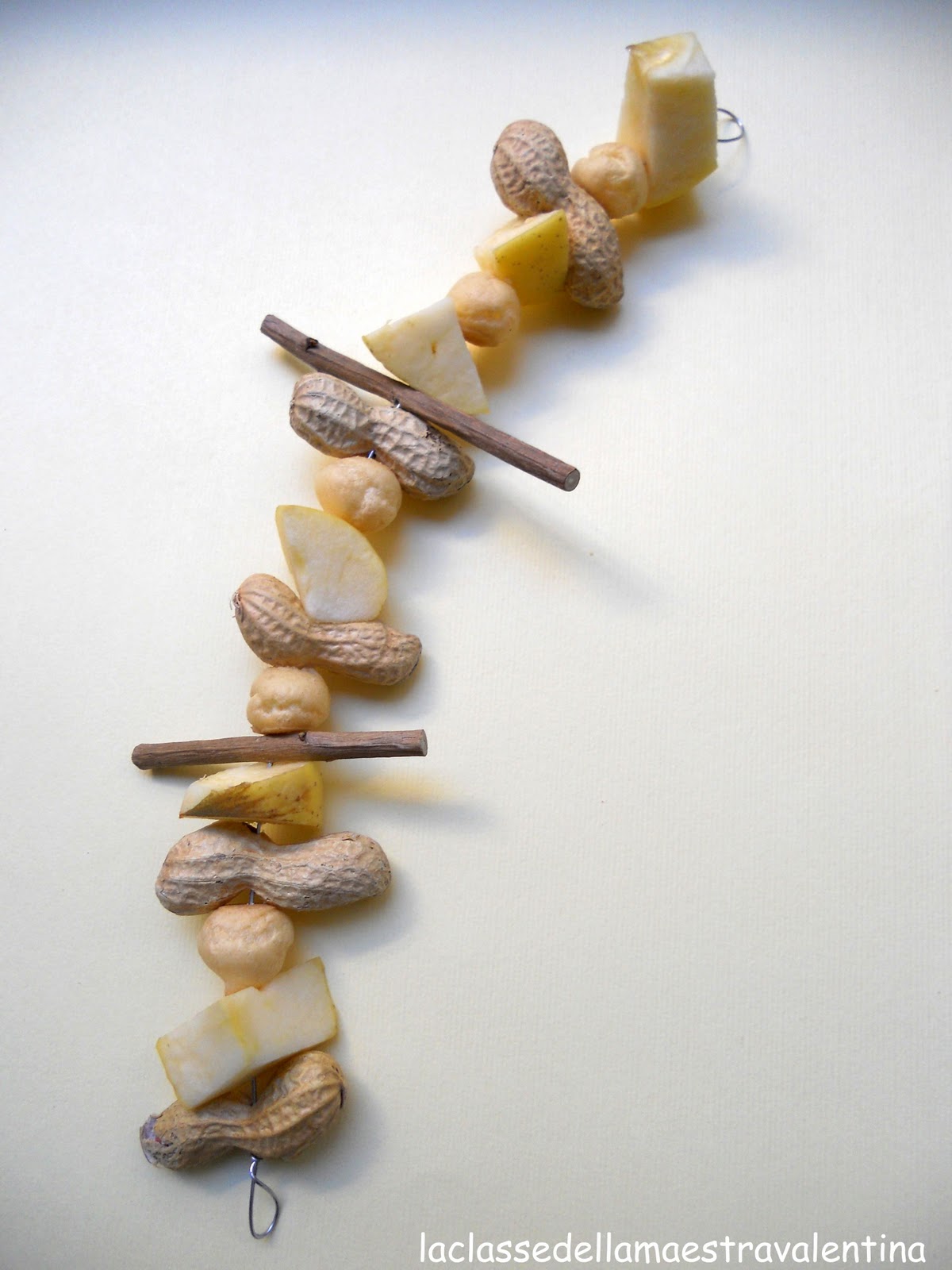 Grazie a dei legnetti forati ed inseriti in mezzo al cibo, gli uccellini hanno una base d’appoggio.