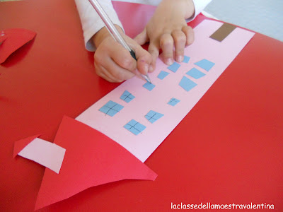 Così ho chiesto ai miei bambini di ritagliare delle finestre, una porta e un tetto, ed incollarli su un rettangolo (facciata casa).
