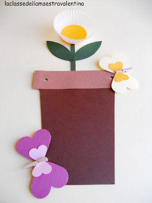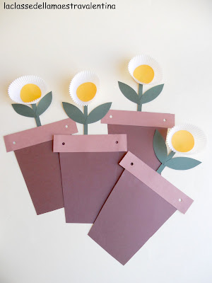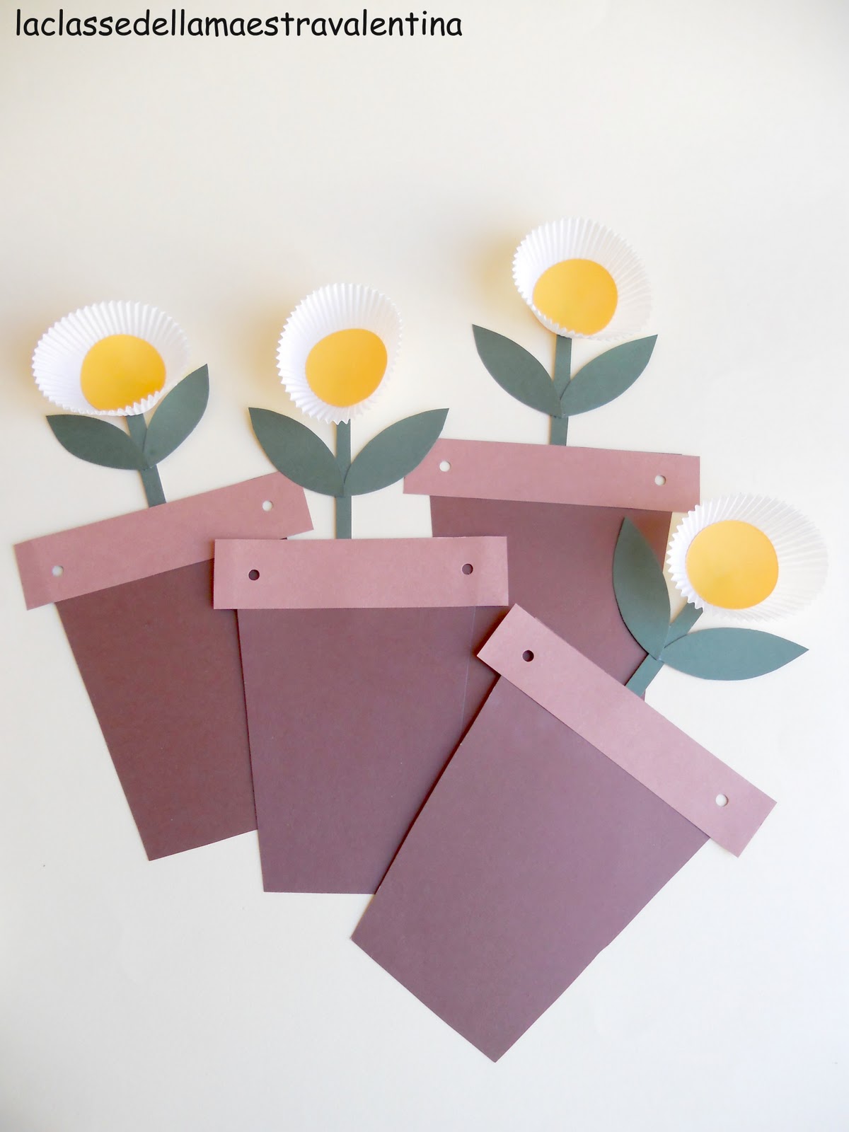Anche per la primavera ho pensato di mettere nei soliti fili, che percorrono la mia classe, queste “ bandierine vasetto ” e, come fiorellino, un pirottino da muffin bianco.