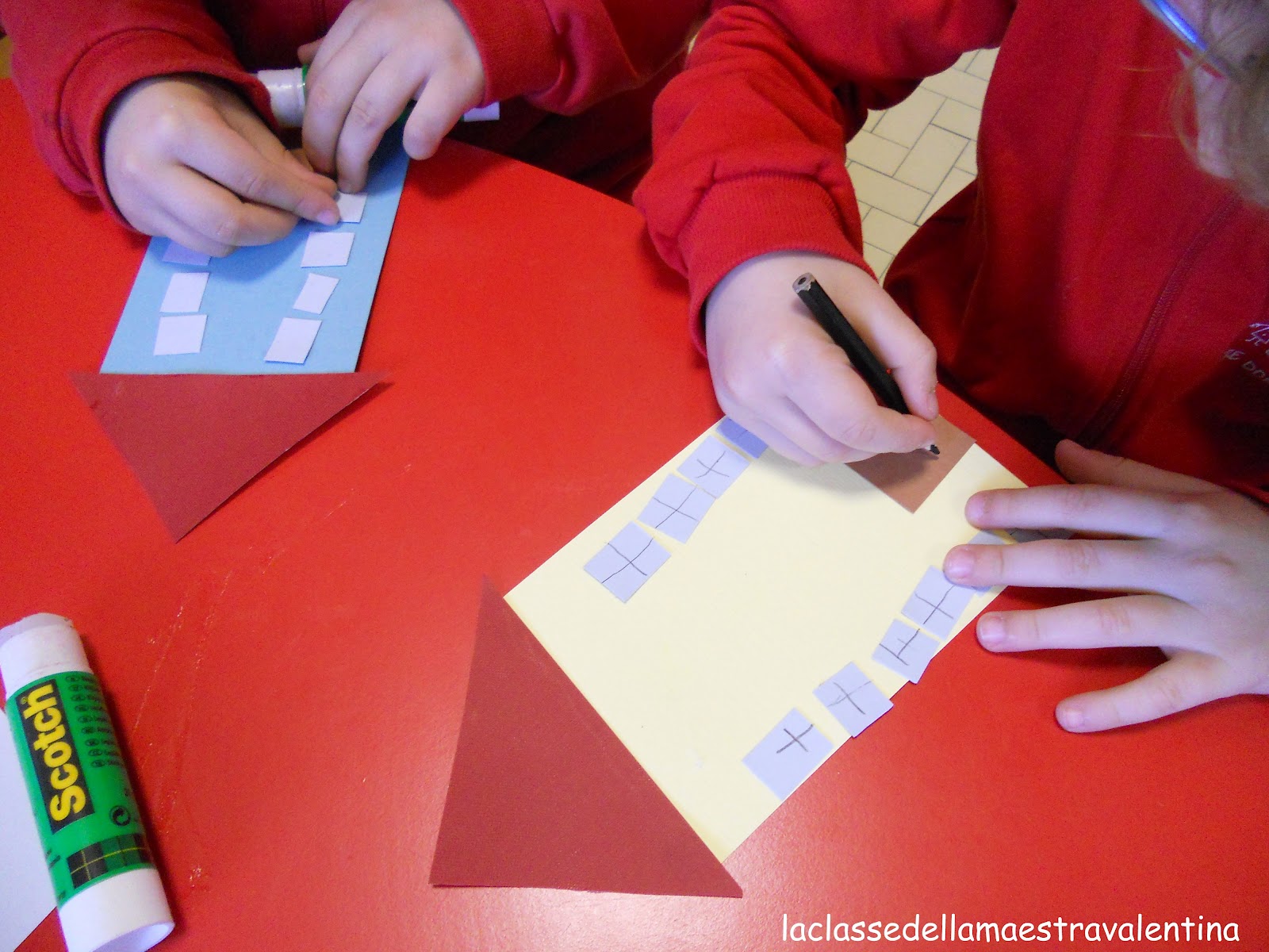 I bambini, con grande abilità, hanno assemblato porte, finestre e tetti in piccole strisce di carta colorata e, dopo averne fatte parecchie, le ho incollate sul pannello della classe.