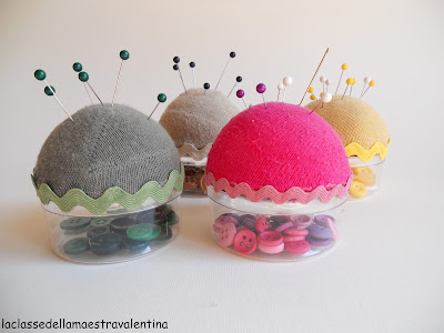 Da quanto tempo non vedevo in giro queste scatoline! Io, invece ho riciclato i vasetti degli omogeneizzati, ma dentro ho messo tutto l'occorrente per le piccole riparazioni: una treccia di fili, un ditale, un ago, degli spilli, delle forbicine piccolissime, un ago di sicurezza, dei bottoni... Me lo porto sempre nella borsa casomai servisse!