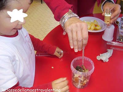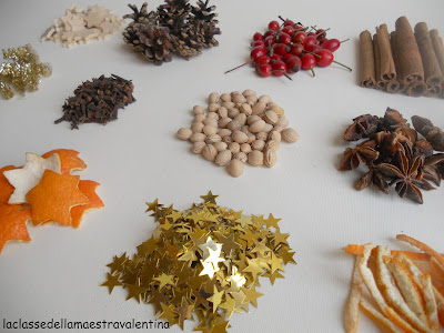 Considerato il progetto di quest'anno (un anno da piccoli esploratori) abbiamo scoperto nuovi elementi della natura, come la cannella, i chiodi di garofano, le pigne, le arance, le bacche di rosa canina, i semi di ciliegia e l'anice stellato.
