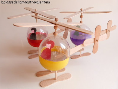 Che soddisfazione quando si riesce a creare qualcosa con poco ... è il caso di questi elicotteri che ho realizzato con le palline di plastica, stecchi, stecchini, abbassalingua, perline di legno e stecchi del gelato.