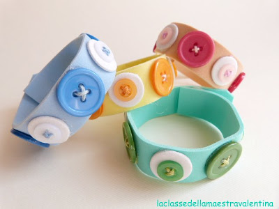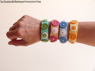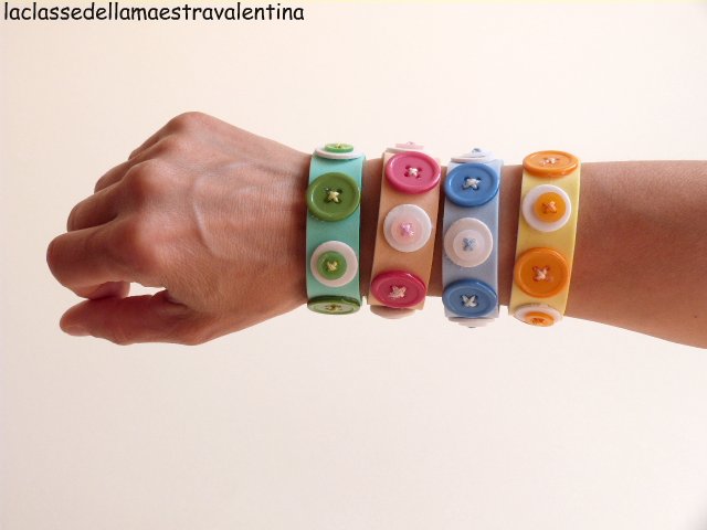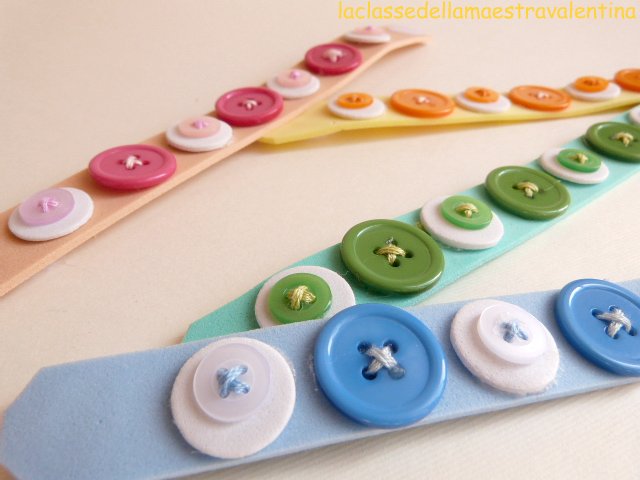 Basta tagliare delle strisce di gomma crepla, fustellare dei cerchietti e incollare sopra ad essi dei bottoni.