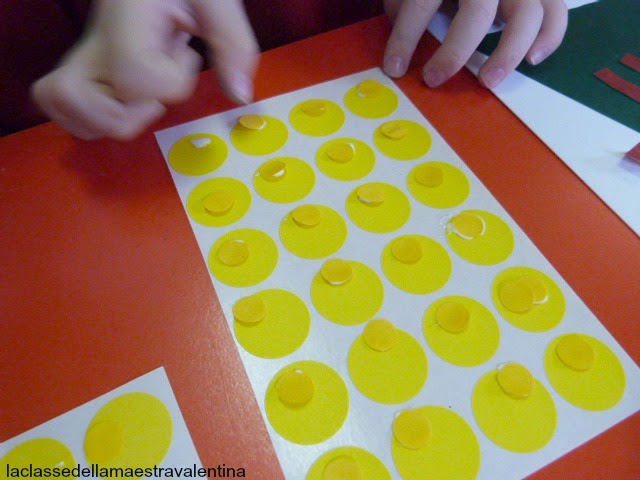 Per la fiammella ho dato 24 etichette (riciclo sanitario) su cui hanno incollato un piccolo cerchietto giallo scuro.