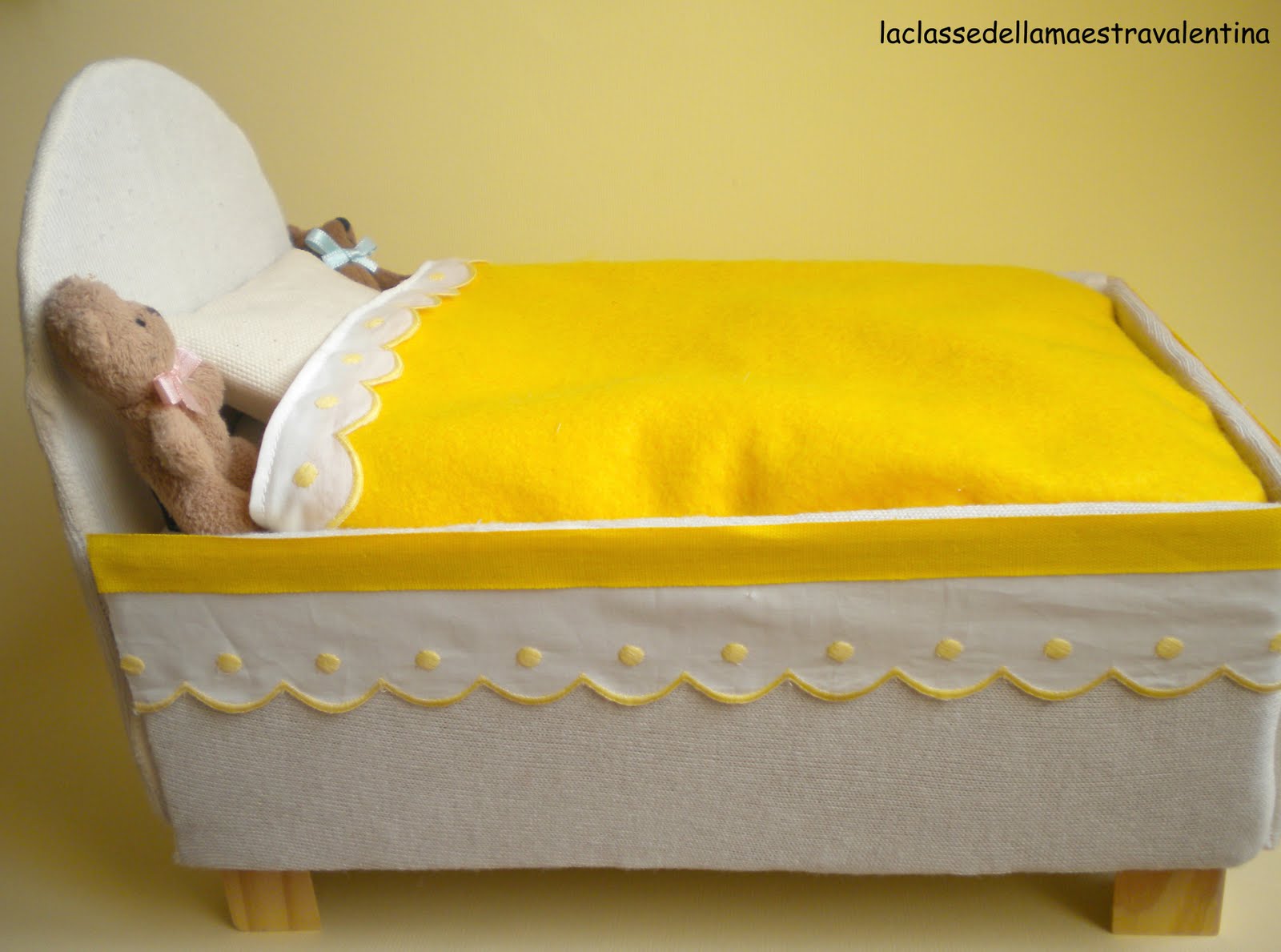 ho cucito il materasso, il lenzuolino, il cuscino, ho fatto la testata del letto e le sponde con cartone ricoperto da calzamaglia e… questo è il risultato.