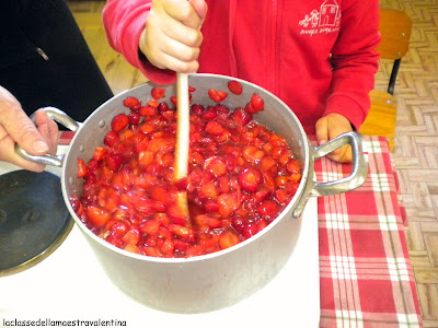 I bambini sono stati molto bravi ad aiutare la nonna, tagliando in pezzettini piccoli le fragole (1kg. pulite), aggiungendo 1 kg di zucchero, 1 busta di Fruttapec (2:1) e girando la marmellata.