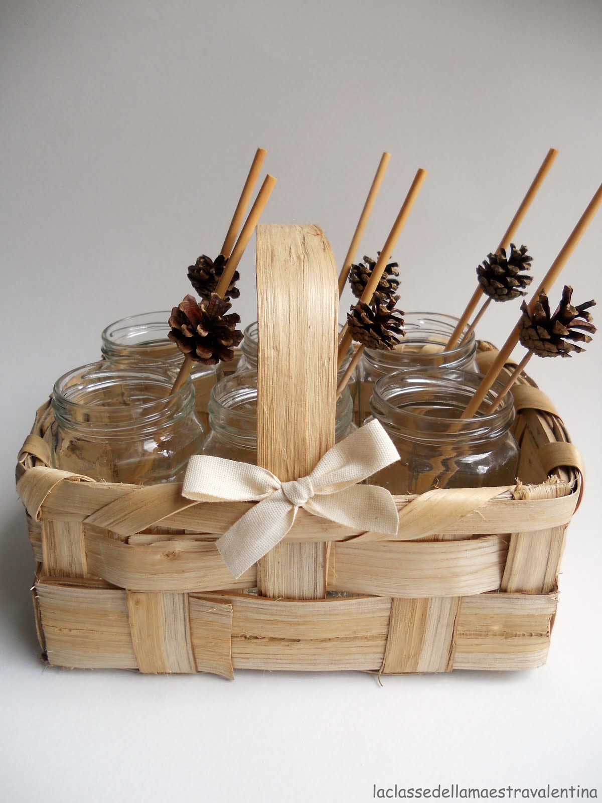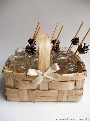 Come bicchieri da cocktail ho utilizzato dei vasetti di vetro (quelli della marmellata) e, come gira cocktail ho usato uno stecco lungo, dove all’estremità ho incollato una piccolissima pigna.