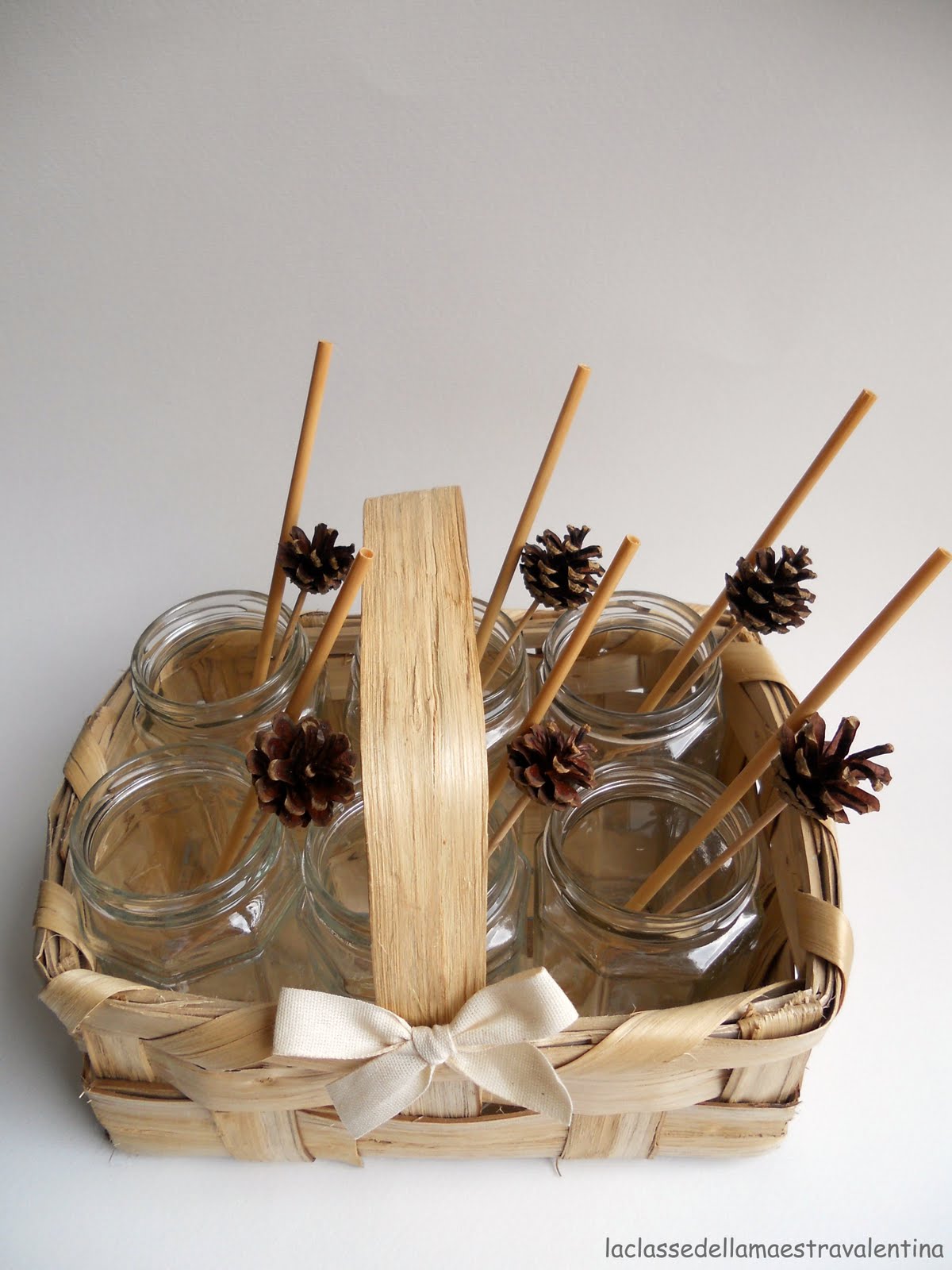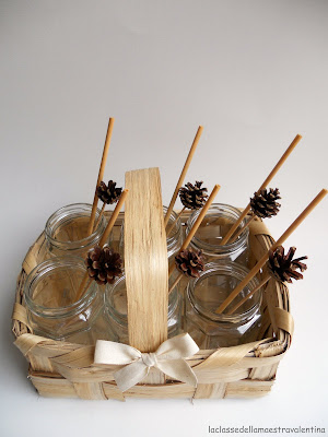 Come bicchieri da cocktail ho utilizzato dei vasetti di vetro (quelli della marmellata) e, come gira cocktail ho usato uno stecco lungo, dove all’estremità ho incollato una piccolissima pigna.