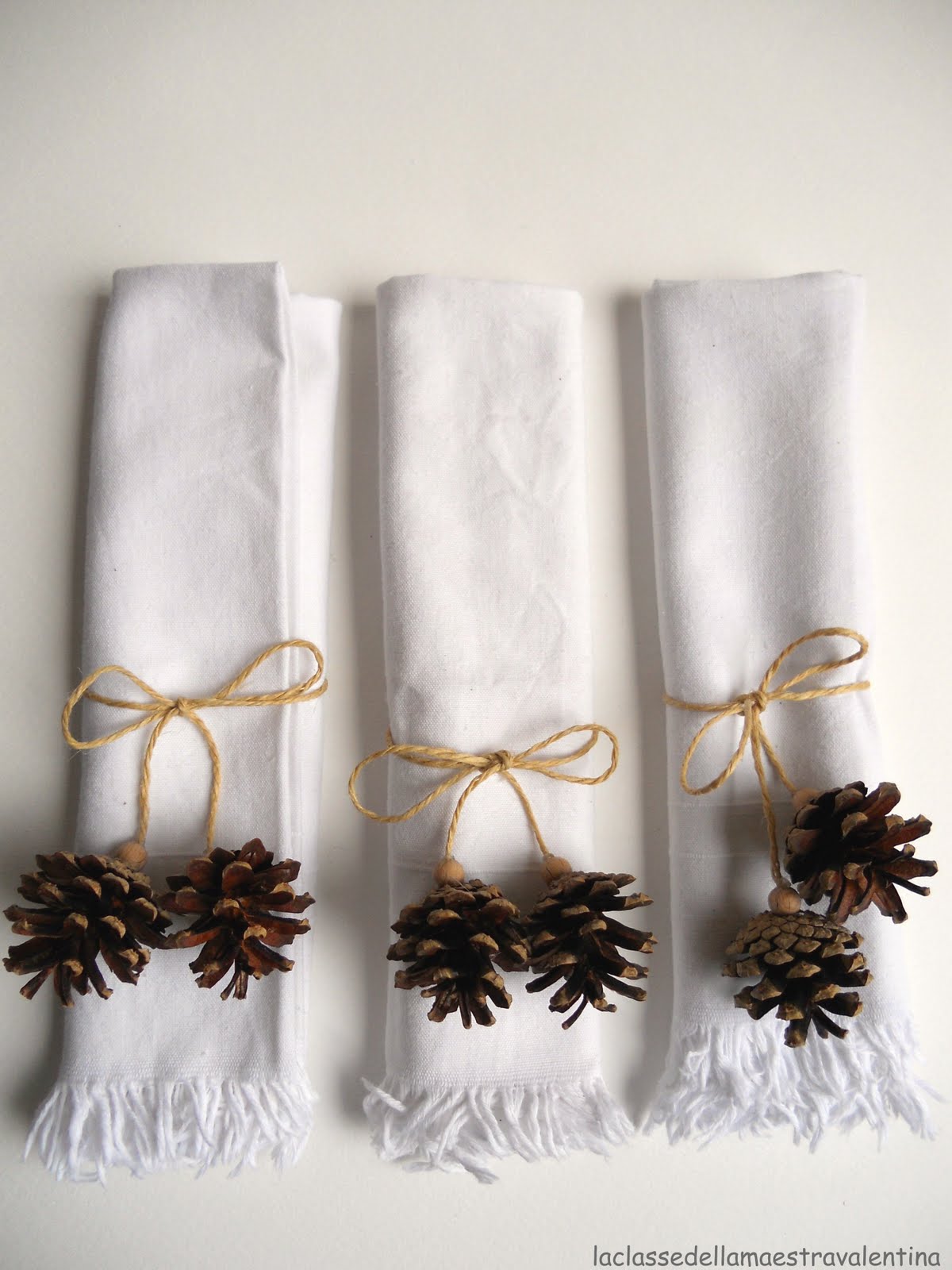 I porta tovaglioli sono realizzati con del cordino, perlina di legno e pigna.