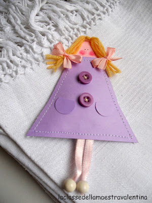 Con il vinavil ho applicato la testa (cartoncino rosa), i bottoni, le taschine, i capelli di lana, le gambette (con palline bianche di legno) e i fiocchetti.