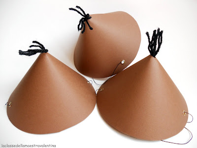Eccomi qua per mostrarvi dei simpatici cappellini fatti a castagna, realizzati con cartoncino marrone, lana, occhielli, filo elastico e lana nera.