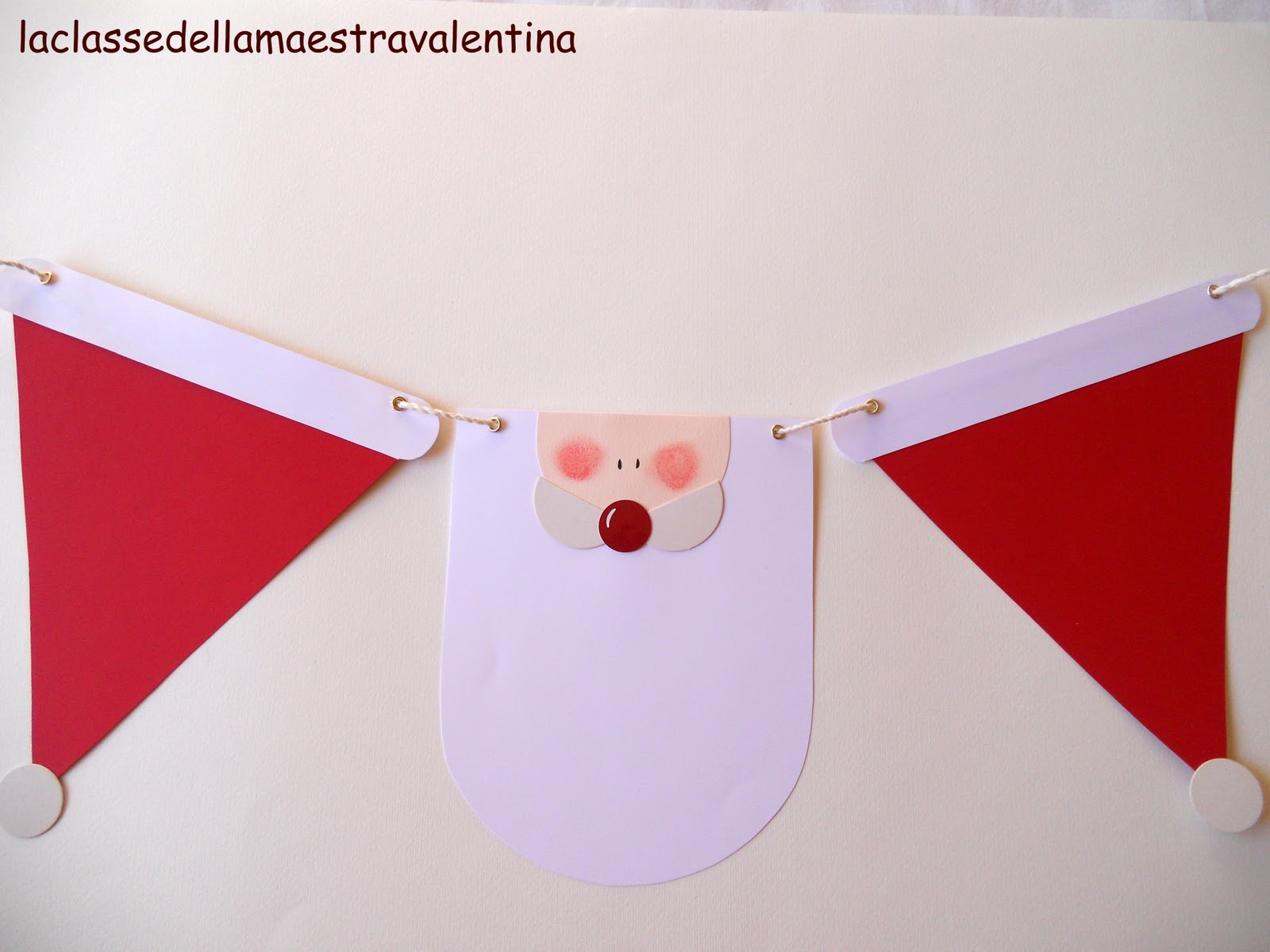 Sono sincera, i blog americani mi hanno contagiato, ovunque ci sono bandierine, di tutti i colori e di tanti modelli e per questo, anche per Natale, ho deciso di mettere nella classe tre fili di bandierine che rappresentano il viso di Babbo Natale ed il suo cappello.