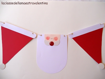Sono sincera, i blog americani mi hanno contagiato, ovunque ci sono bandierine, di tutti i colori e di tanti modelli e per questo, anche per Natale, ho deciso di mettere nella classe tre fili di bandierine che rappresentano il viso di Babbo Natale ed il suo cappello.