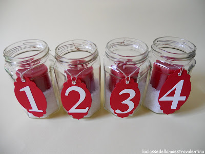 Per queste lanternine ho utilizzato dei vasetti di vetro ( marmellata) che ho riempito con del sale grosso e una candelina rossa.