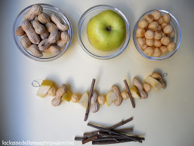 Fate tagliare ai bambini dei quadretti di mela e, liberamente, fate infilare tutto l’occorrente.