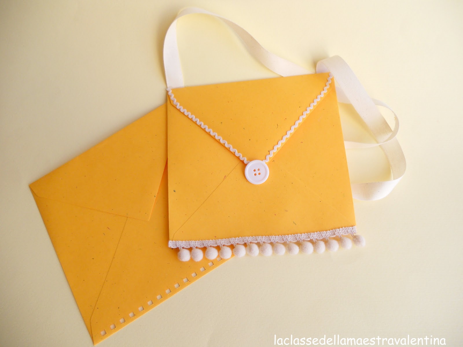 Con una busta, un bottone e un po’ di fettuccia, si può realizzare una BORSETTA.