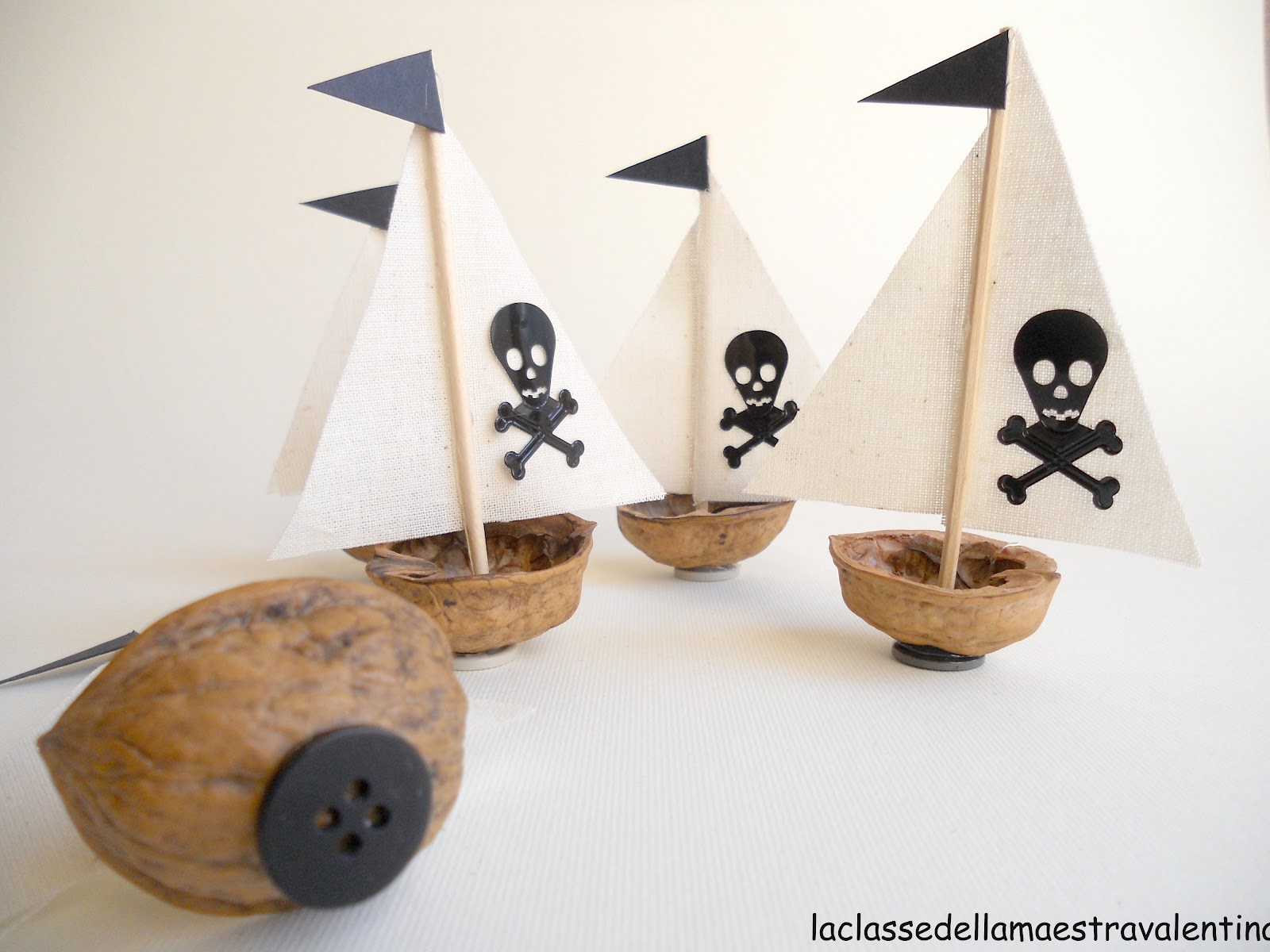 Barchette pirata, realizzate con gusci di noce, stecchino e pezzetto di stoffa.