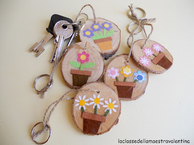 Grazie a un nonno falegname, mi sono fatta tagliare a fette dei piccoli tronchi di legno, con il succhiello ho fatto un foro (per passare un cordino e un anello), e con cartoncino, colla per decoupage e lucidina (liquido che rende lucida la superficie) i bambini hanno realizzato dei portachiavi per la loro mamma.