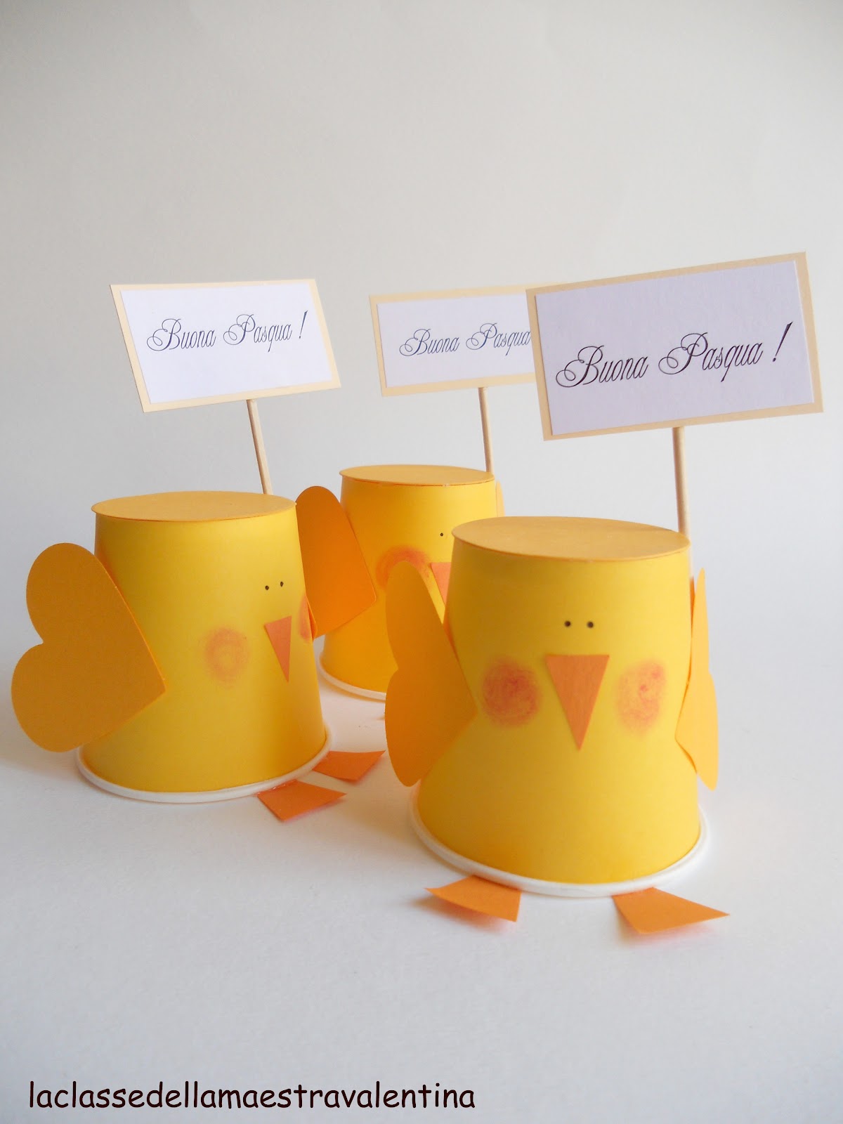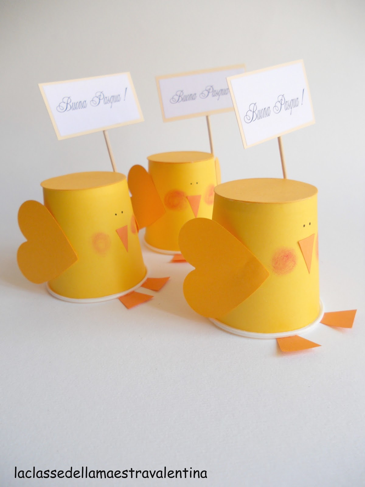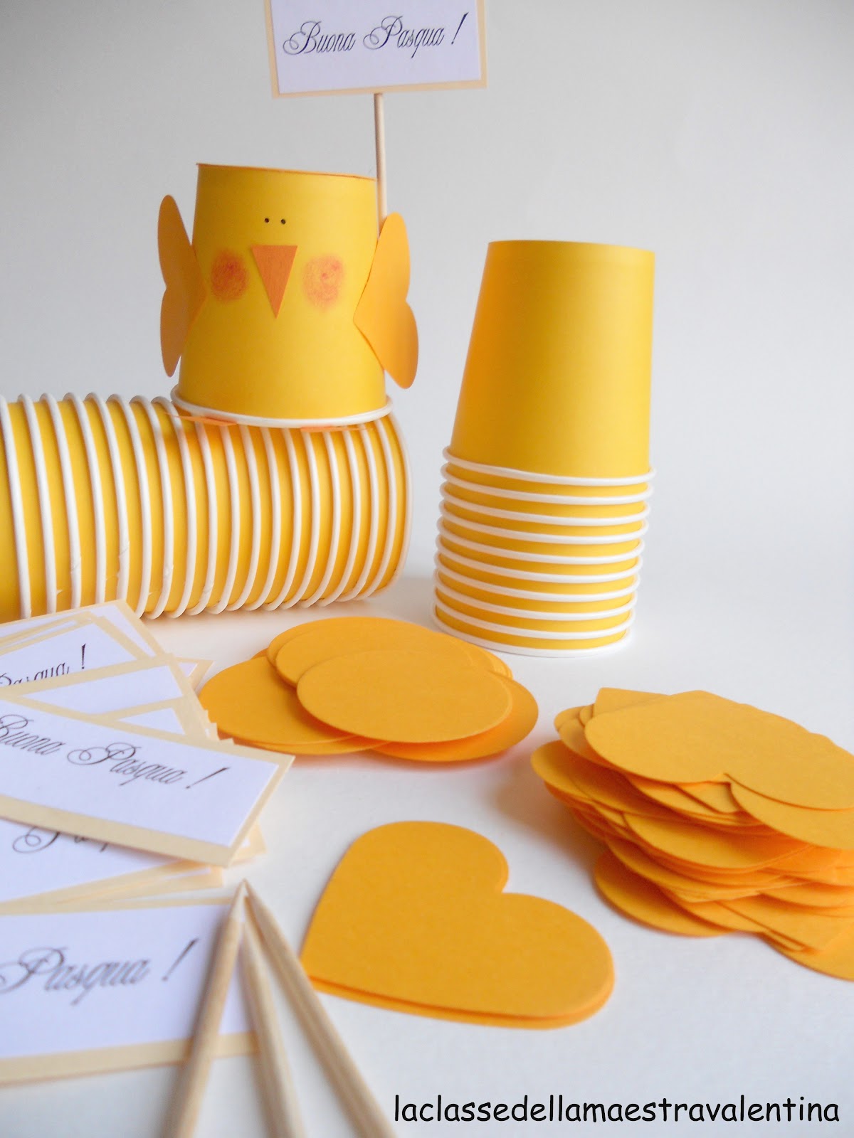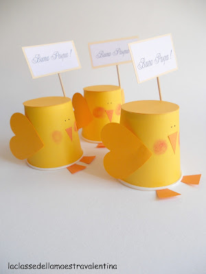 Per il dono di Pasqua per mamma e papà, ho dato ai miei bambini un bicchierino giallo, del cartoncino giallo e arancione e colla stick.