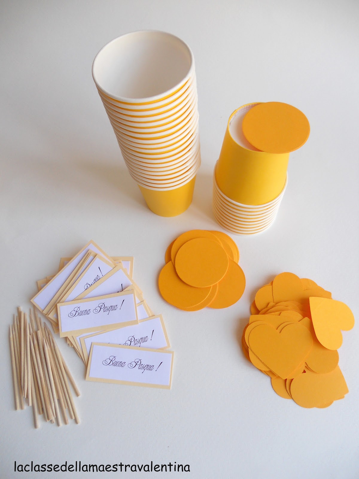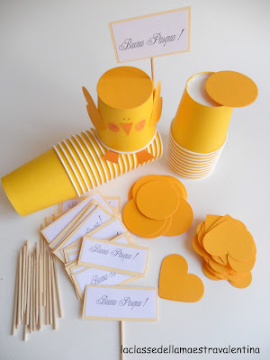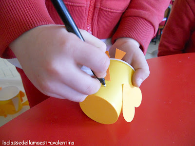 Per il dono di Pasqua per mamma e papà, ho dato ai miei bambini un bicchierino giallo, del cartoncino giallo e arancione e colla stick.