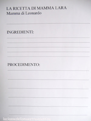Ho consegnato a ciascuno di loro un foglio da compilare con  una loro ricetta, dopodichè le ho fotocopiate, assemblate e "rilegate" con un dorsino rosso.