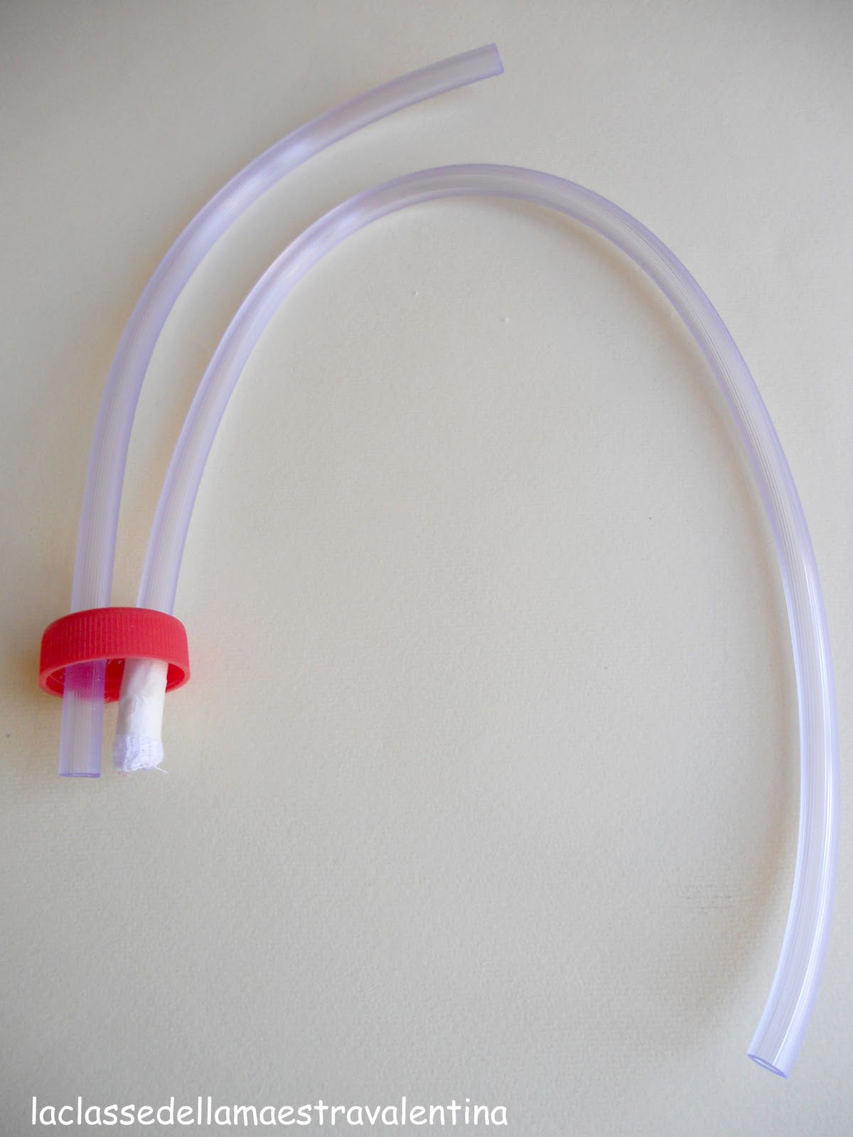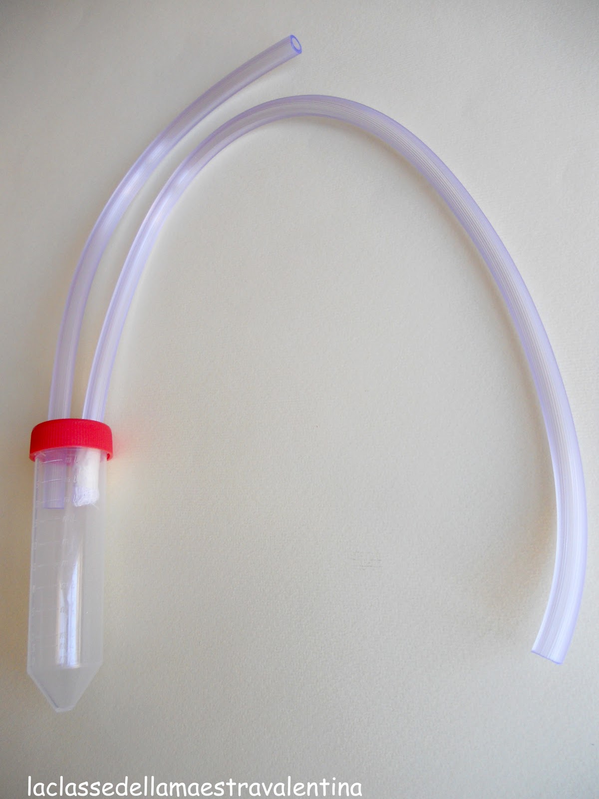 Questo aspiratore ha due tubi (tubi dell'ossigeno), inseriti nel tappo della provetta, precedentemente bucato con la punta della pistola a caldo.