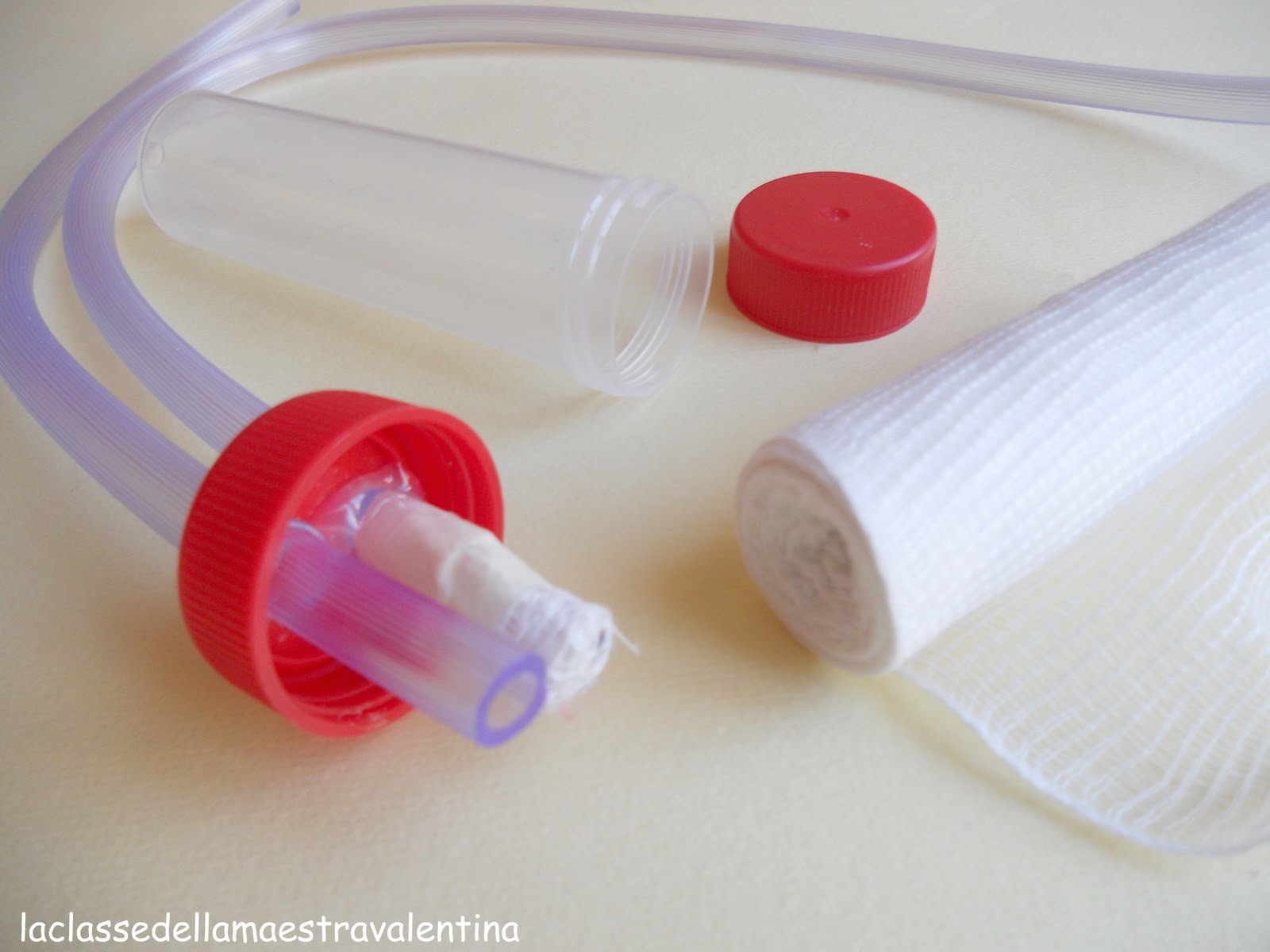 Il tubo con la garza si mette in bocca, l'altro si posiziona sul semino, aspirandolo.