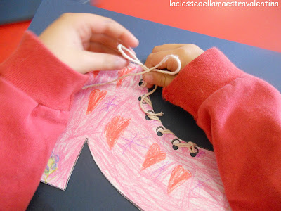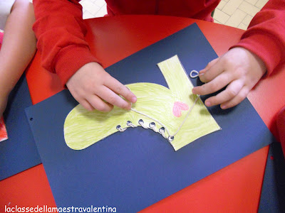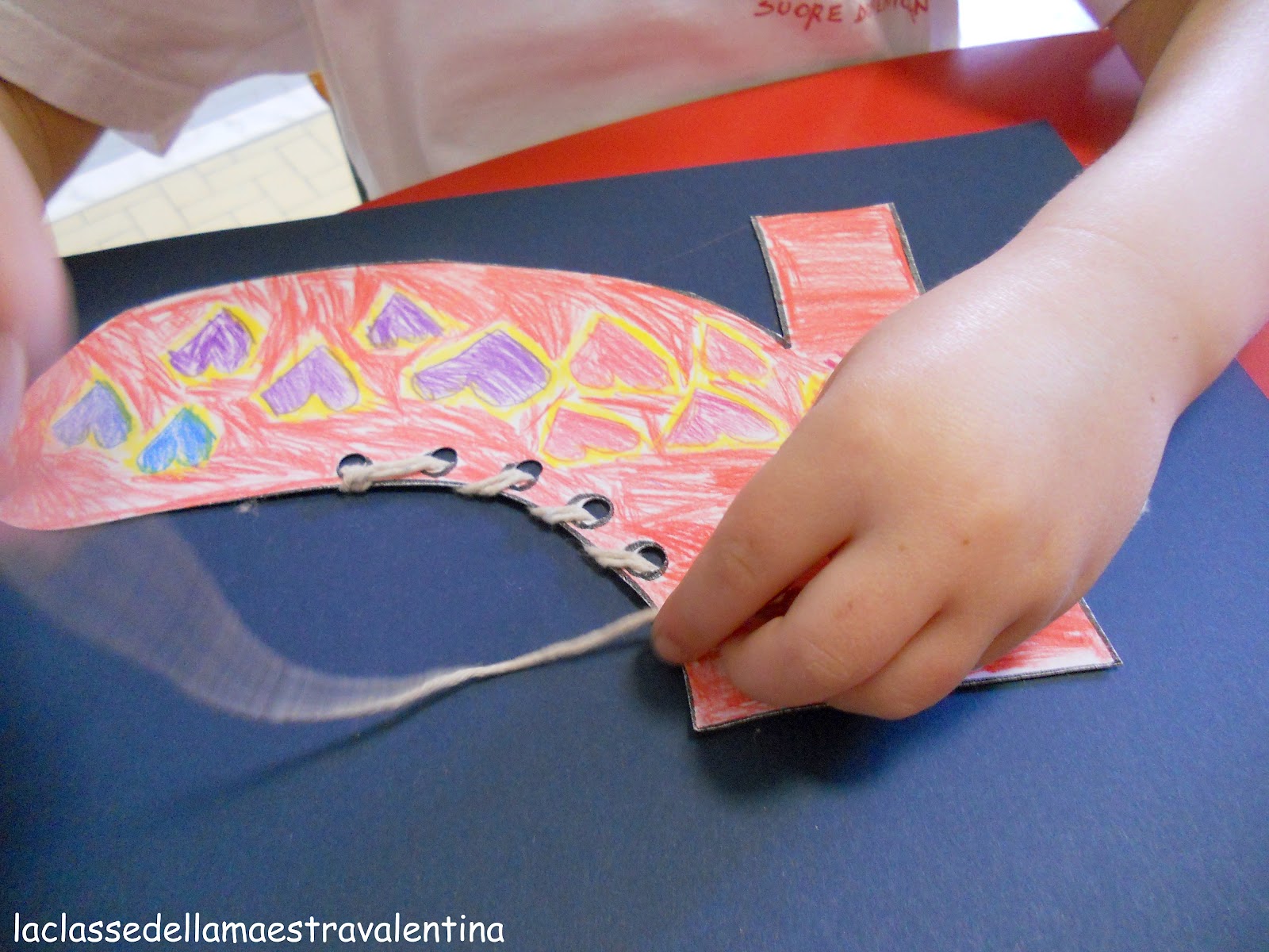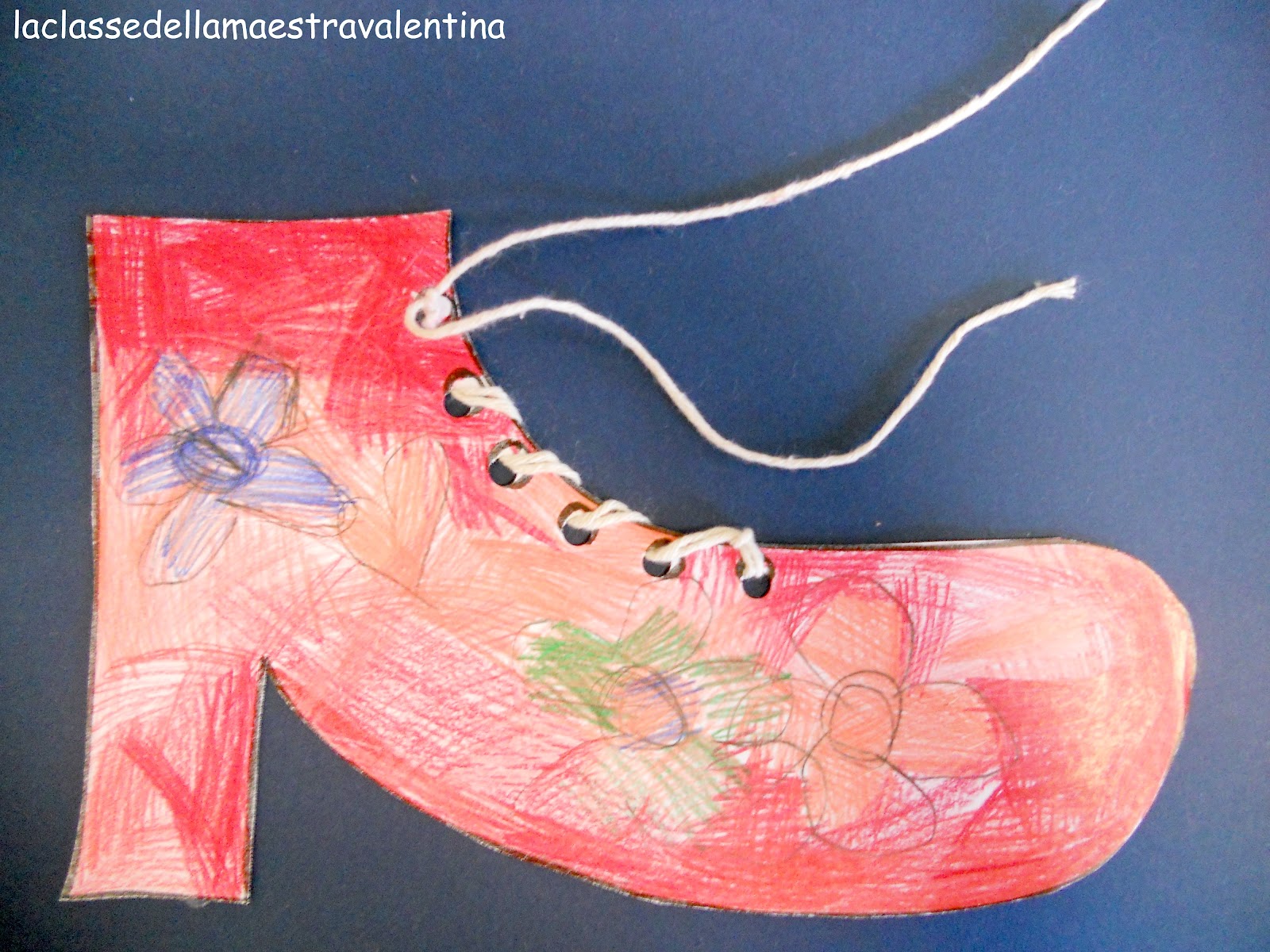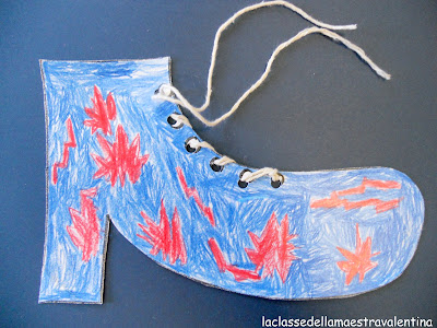 Dopo aver fatto colorare a loro piacimento una scarpa, l'ho ritagliata, forata e ho passato nei buchi un cordino.