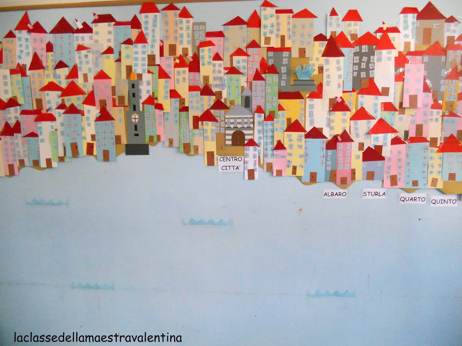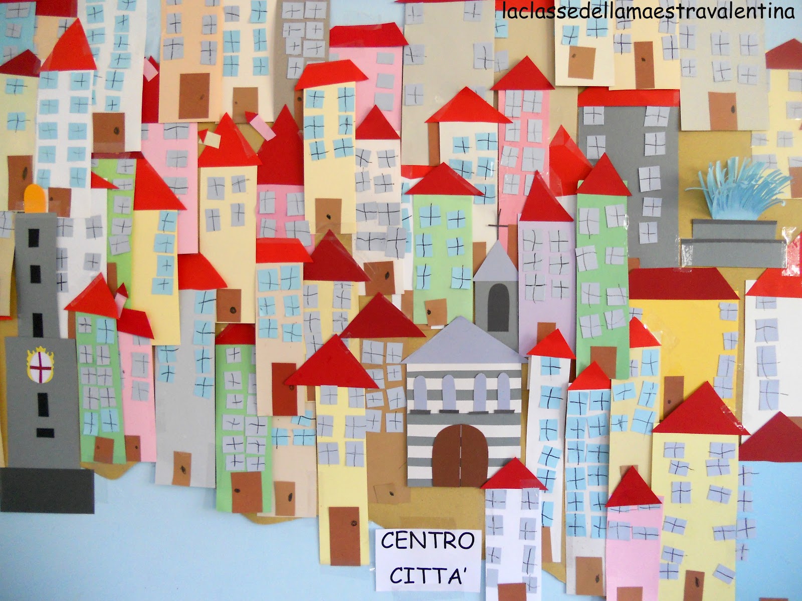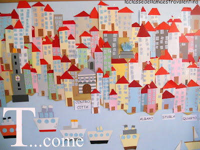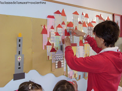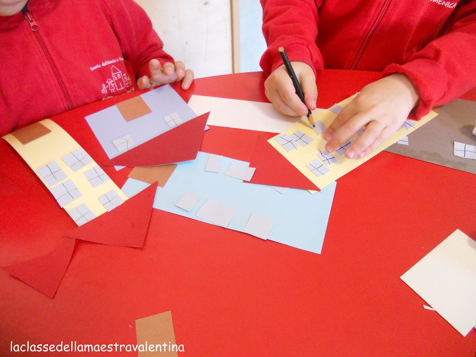 I bambini, con grande abilità, hanno assemblato porte, finestre e tetti in piccole strisce di carta colorata e, dopo averne fatte parecchie, le ho incollate sul pannello della classe.
