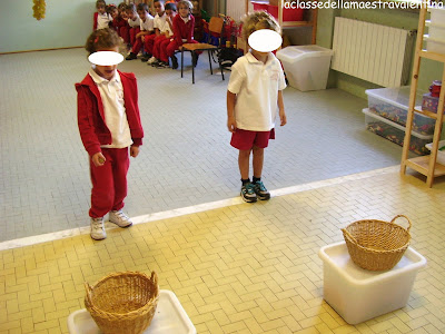 Successivamente, ho diviso in due squadre i bambini che, nel minor tempo possibile, dovevano correre sotto il grappolo, saltare, staccare un chicco e lanciarlo nel cestino.