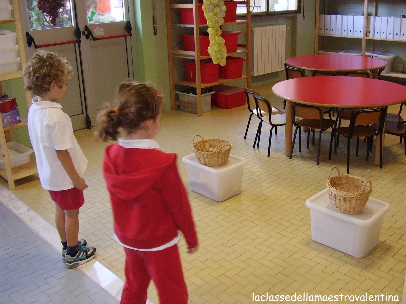 Successivamente, ho diviso in due squadre i bambini che, nel minor tempo possibile, dovevano correre sotto il grappolo, saltare, staccare un chicco e lanciarlo nel cestino.