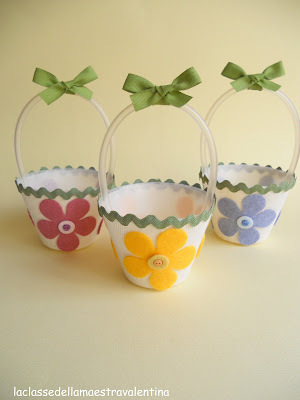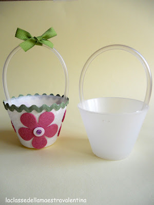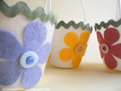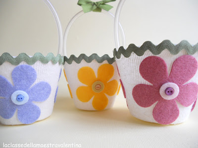 Oggi vi parlo di riciclo, mostrandovi delle vaschette di plastica (sorreggi uovo di Pasqua), ricoperte da una calza e decorate con fiori in pannolenci e trenetta.