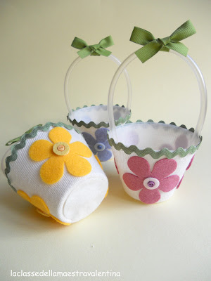 Oggi vi parlo di riciclo, mostrandovi delle vaschette di plastica (sorreggi uovo di Pasqua), ricoperte da una calza e decorate con fiori in pannolenci e trenetta.