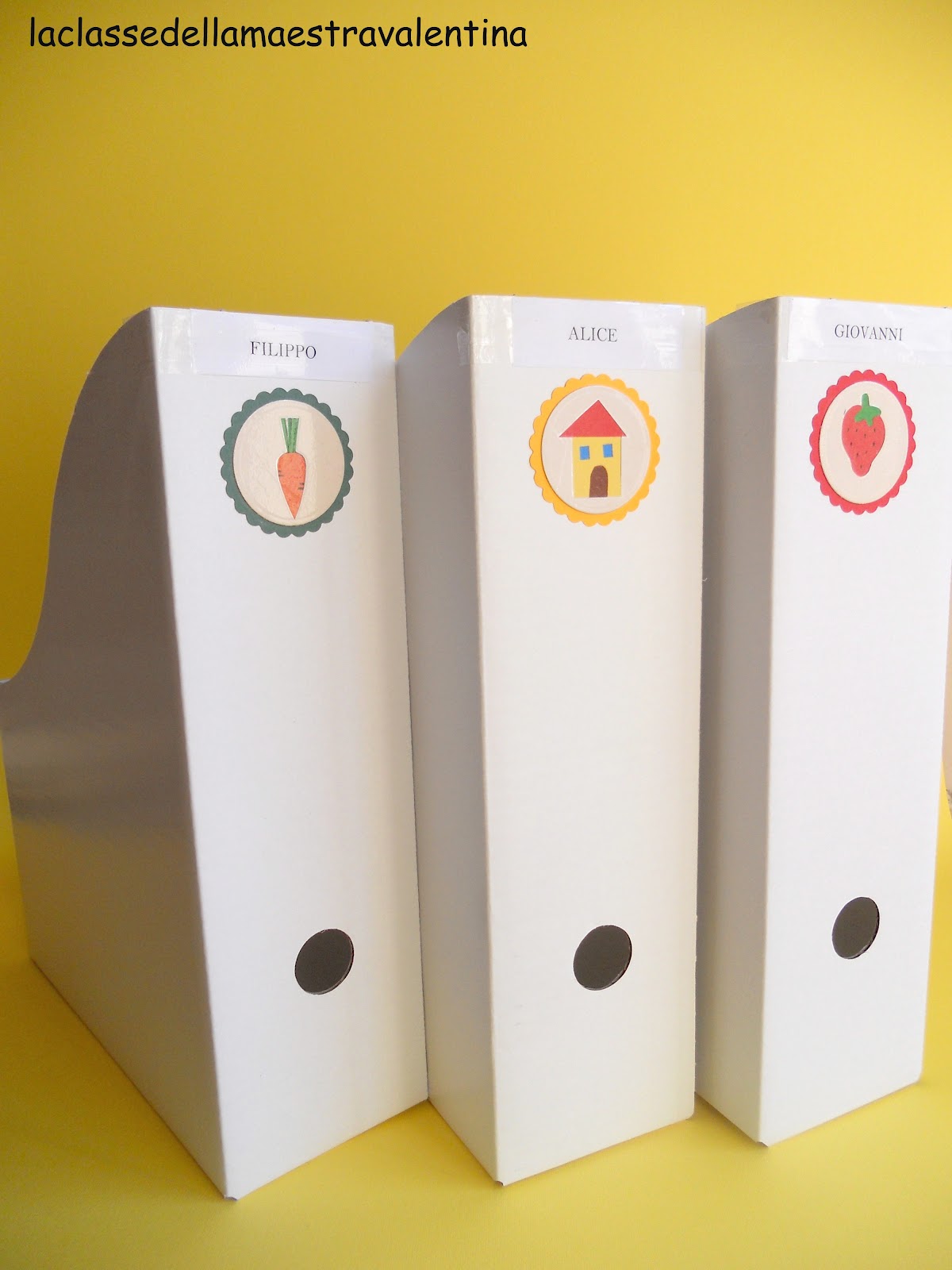 Ho incollato sul dorso i contrassegni con il rispettivo nome, e li ho sistemati in classe nella scaffalatura... dove potrete ammirarli nel prossimo post... ebbene si, tra pochi giorni vi farò vedere la mia classe con un servizio fotografico super dettagliato.