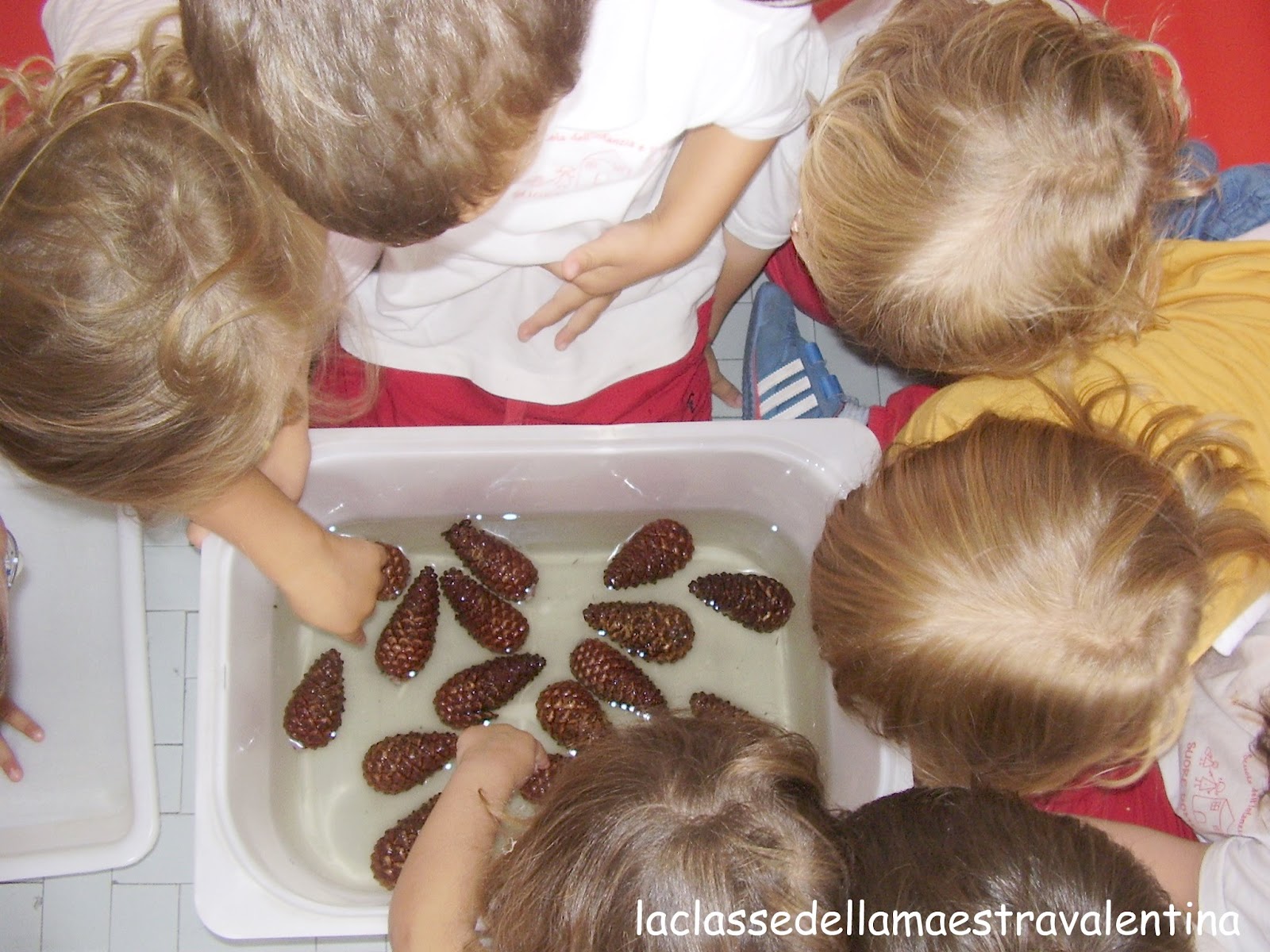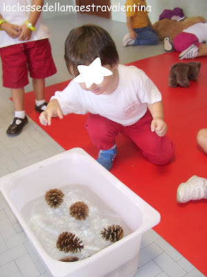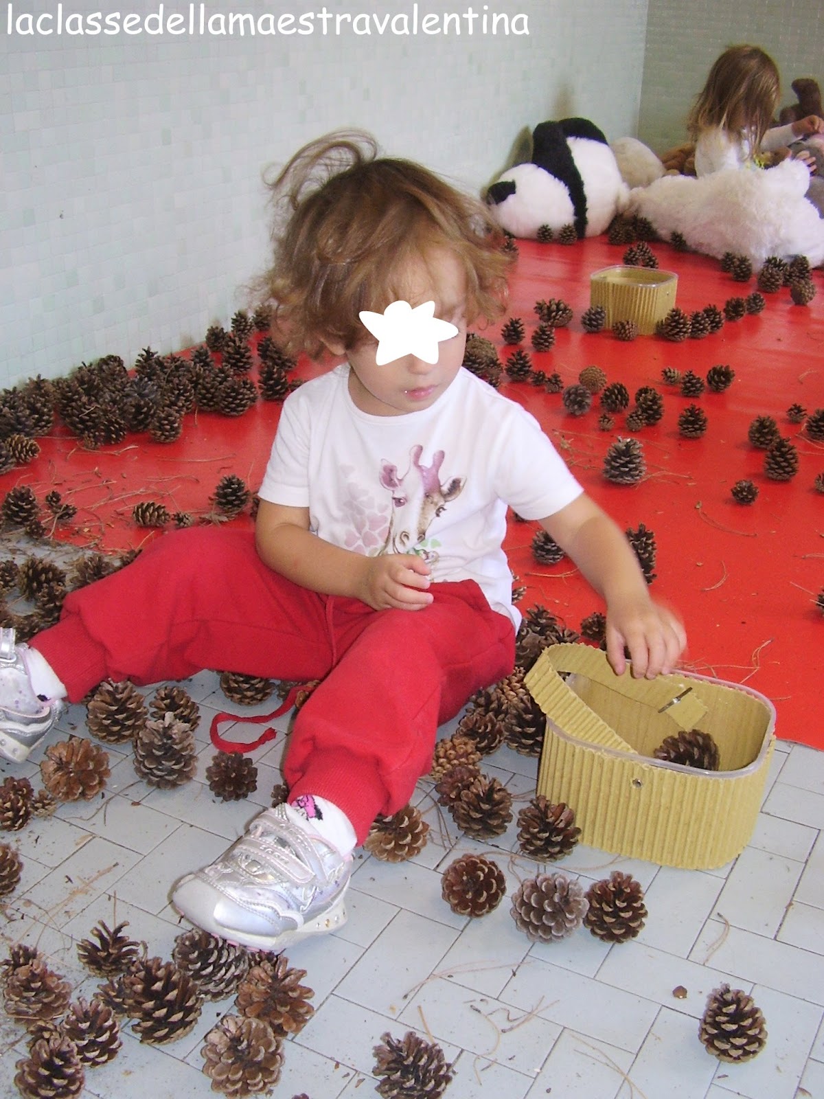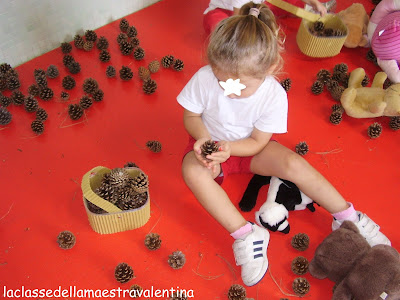E così, dopo aver fatto questa "magia", ho consegnato ad ogni bimbo una pigna da portare a casa, per mostrare a mamma e papà cosa abbiamo scoperto a scuola.Ma il divertimento non è finito... avete presente i sacchi blu dell'Ikea?... ebbene, immaginateli pieni di pigne... ora immaginatele tutte sparse in classe.