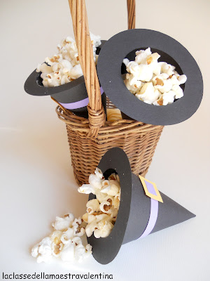 E per finire, dei piccoli cappelli da strega, da utilizzare come cartoccetti per pop corn.