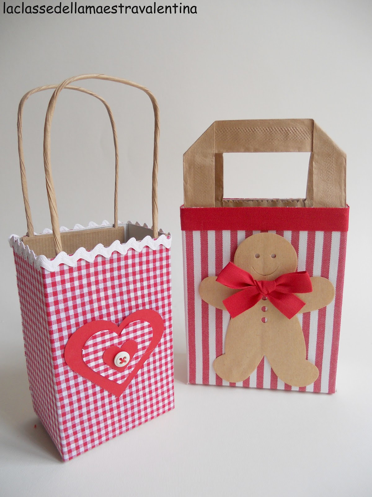 Bellissime davvero! Natale scorso avevo fatto dei sacchetti di carta aprendo un normale sacchetto e utilizzandolo come modello da ricalcare su cartoncini di varie fantasie e decorati dalle bimbe....ma questa tua idea supera la mia di granlunga perchè c'è anche il riciclo incorporato!!! Lena