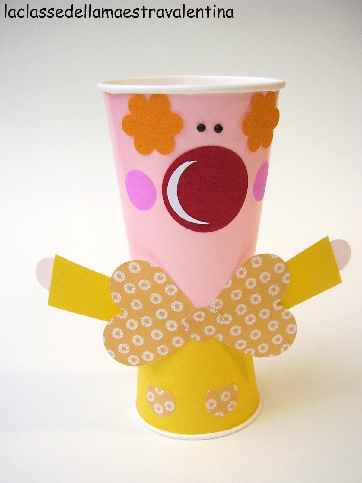 Come porta posate o come recipienti porta patatine, ho fatto questi tre pagliacci, realizzati con 2 bicchieri di carta di dimensione differente, cartoncino, carta fantasia e 2 piccoli ferma campioni neri per gli occhi.