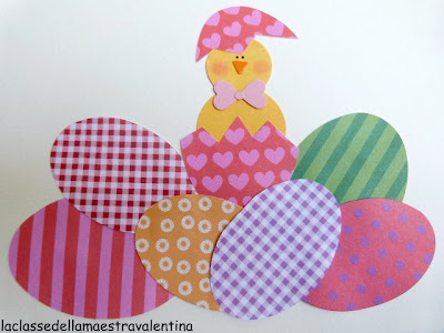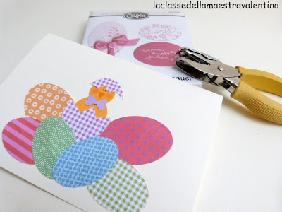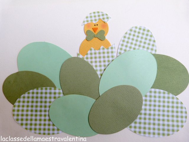 Basta fustellare carta fantasia o cartoncino con i tre ovali di diversa dimensione. Per il pulcino, due cerchi gialli e, con una fustella a pinza a triangolo, potete realizzare il becco del pulcino.
