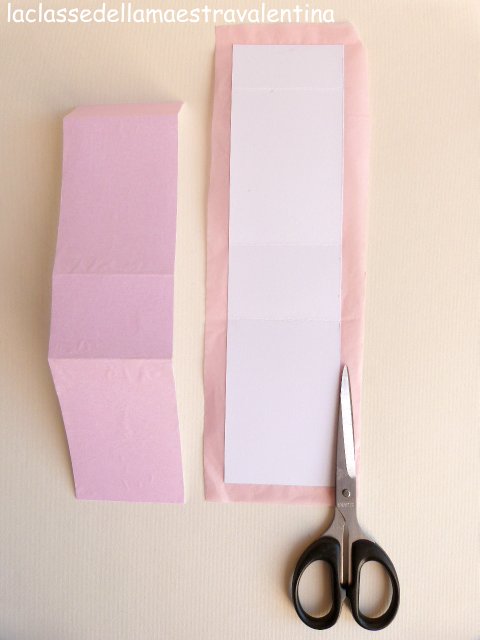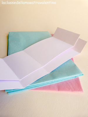 Chiaramente i colori da utilizzare sono il rosa e l'azzurro, quindi ho incollato con la colla stick della carta velina sulla striscia di cartoncino.