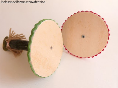 Come potete notare, per il corpo della bambolina non ho utilizzato le classiche mollette svedesi, ma sono dei bastoncini di legno che il marito di Cristina ha modellato con il tornio... la base piatta mi ha permesso di fissarla al cerchio di compensato con una vite.