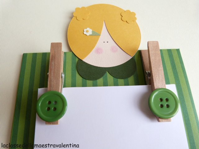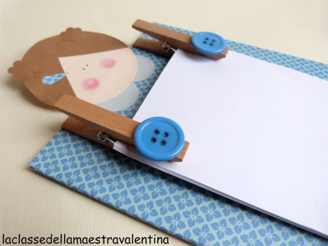 Realizzate un viso di bimba, da incollare sulla tavoletta, e per finire 2 mollette di legno con 2 bottoni.