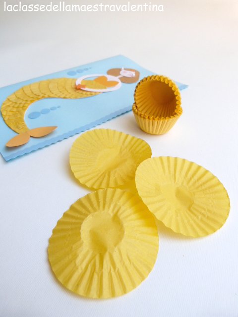 Guardandoli, mi è venuto in mente di fare la coda delle sirenette così, dopo aver fatto il corpo (QUI trovate i pezzi che occorrono), ho iniziato a fare degli strati con pezzettini di pirottino colorato, incollando tutto su una base di cartoncino.
