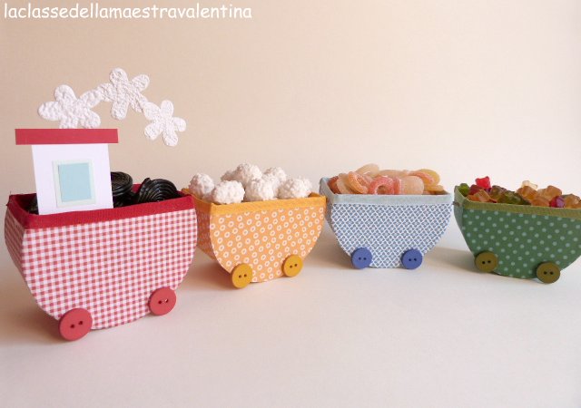 Ecco qui un trenino da mettere sul tavolo pieno di dolcetti.