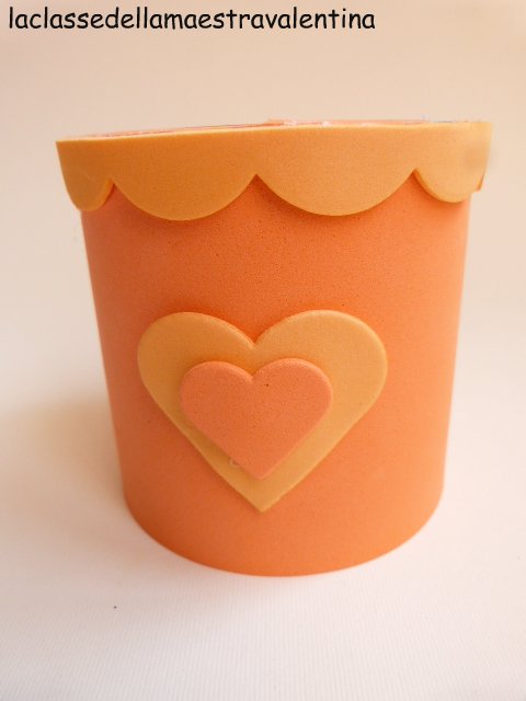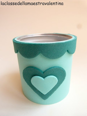 Tornando ai barattoli, basta incollare con la colla a caldo un rettangolo di gomma crepla e decorarla con bordi e cuori fustellati.