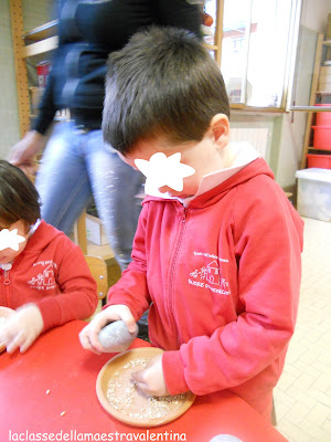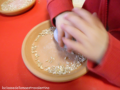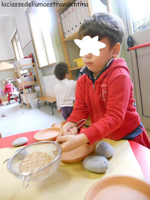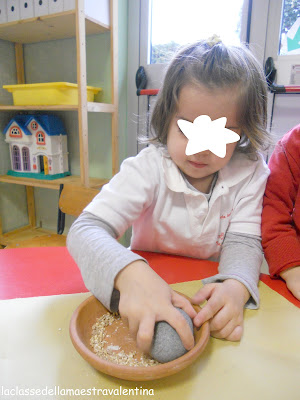 Oggi i miei bimbi si sono divertiti a fare i piccoli mugnai, schiacciando i chicchi di grano con una pietra di mare.