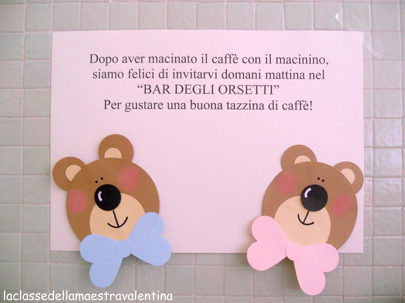 Io sono mattiniera, come te, almeno nella navigazione e nell'aggiornamento del blog:-) quindi sono sempre la prima a leggere i tuoi post :-) fantastica l'idea del bar, i bambini devono essere si divertiti tantissimo e poi immagino la soddisfazione di vedere come dai chicchi si arriva al caffé da bere. Insomma, sempre piú dispiaciuta che il mio piccolo non sia tra quegli orsetti!!!!!!!!!! Peró il macinino c'è l'ho anche io quindi macineremo caffé!